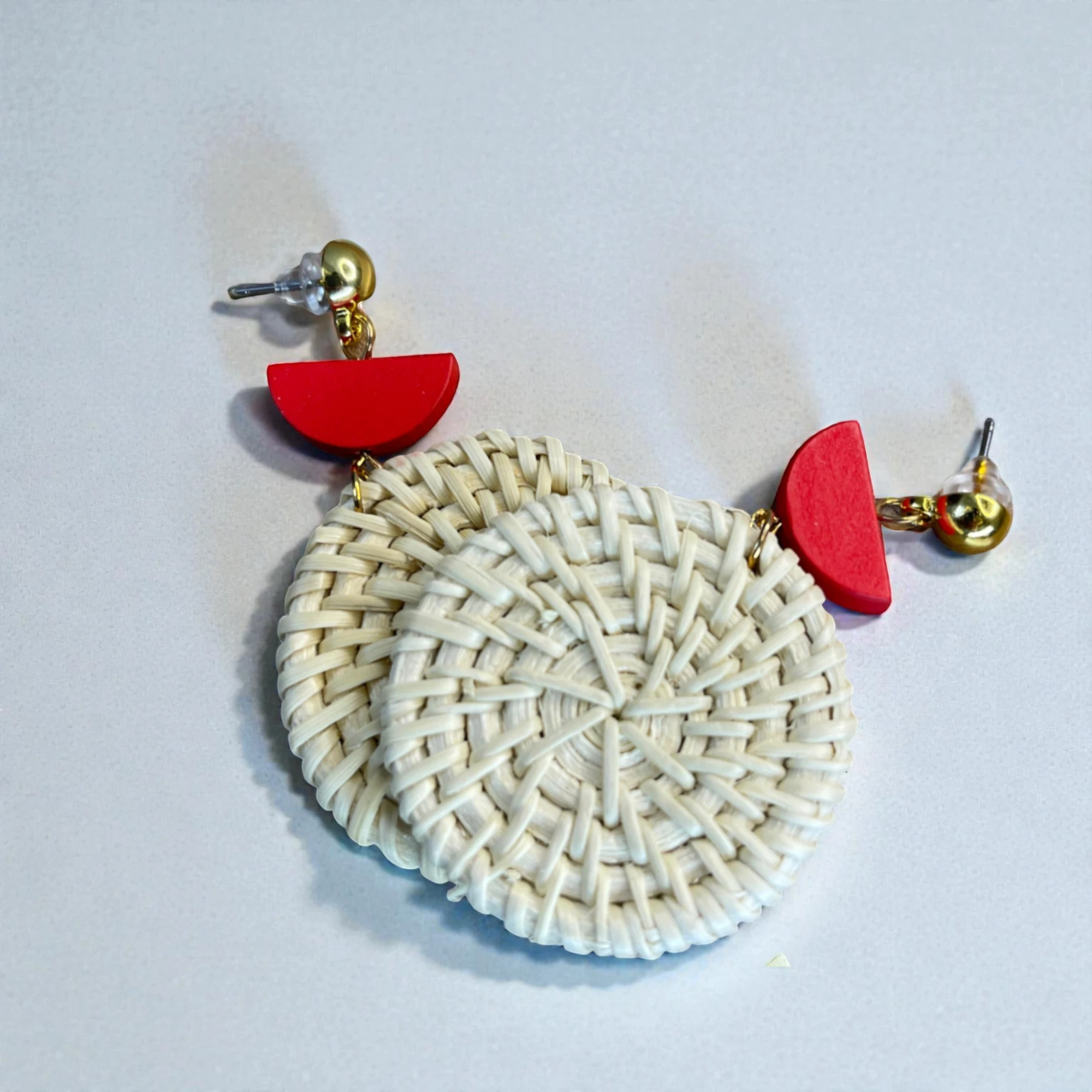 Elegant, eco-friendly earrings featuring a sleek round design with bold red accents. Handcrafted from sustainable materials for a timeless, unique look.